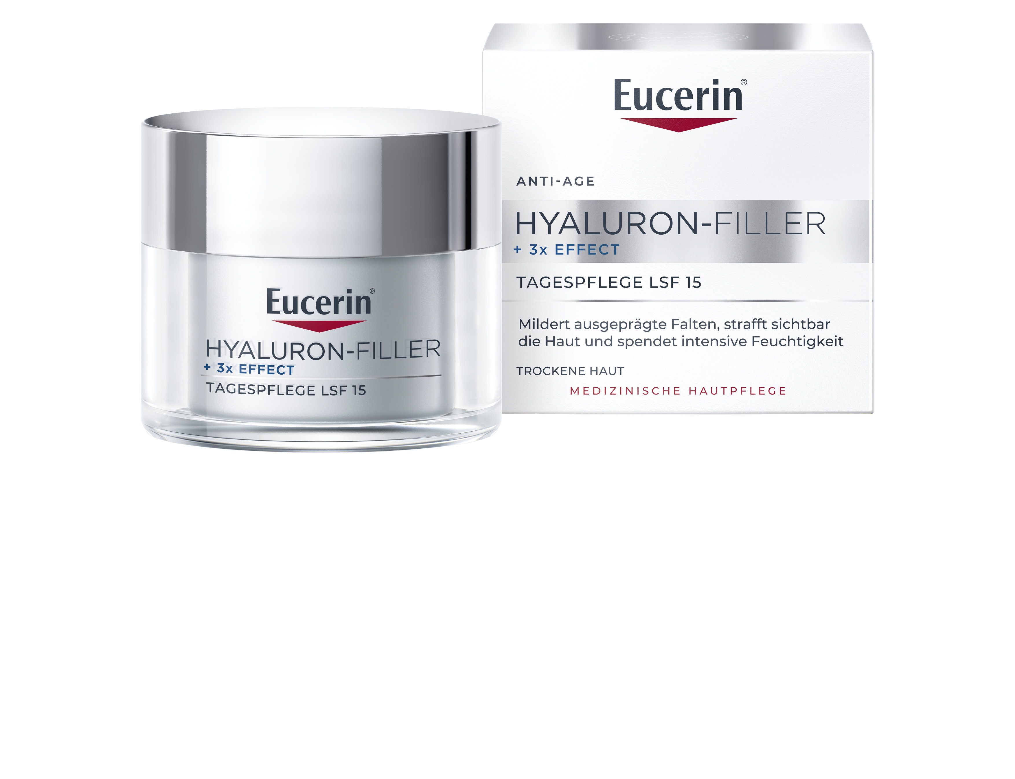 Die Eucerin HYALURON-FILLER Tagespflege für trockene Haut ist eine Anti-Age Tagescreme mit Hyaluron, die spezell für trockene Haut entwickelt wurde. Sie enthält eine einzigartige Kombination aus langkettigen und 40 mal kleineren, kurzkettigen Hyaluronsäure-Molekülen, um selbst ausgeprägte Falten von innen heraus aufzufüllen. Zusätzlich regt bioaktives Saponin die natürliche, hauteigene Hyaluronsäureproduktion an, um die Hautfeuchte zu verbessern und Falten zu mildern. LSF 15 mit UVA-Schutz beugt vorzeitiger Hautalterung und der Verstärkung von Falten vor. Die Pflege eignet sich ausgezeichnet als Make-up-Grundlage.
