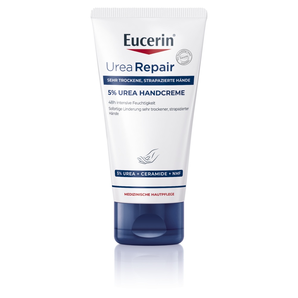Die Eucerin UreaRepair PLUS Handcreme 5% enthält den einzigartigen, hautverwandten Repair-PLUS-Komplex: Urea und weitere natürliche Feuchthaltefaktoren (Natural Moisturing Factor = NMF) spenden und binden intensiv Feuchtigkeit und sorgen so für einen gesunden Feuchtigkeitsgehalt der Haut. Zusätzlich stärken Ceramide die physiologische Hautbarriere, damit die Feuchtigkeit nicht entweichen kann.